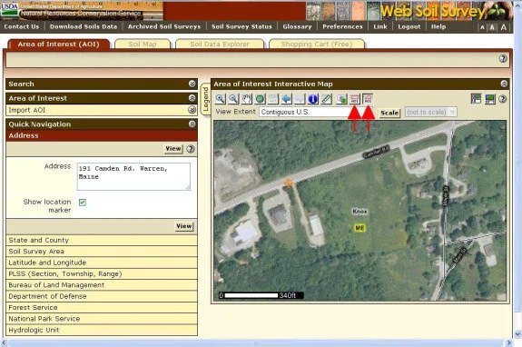 We’ll use the Address or State and County tab in the Quick Navigation menu to search for the area we want. In this example, we’ll use the former Knox-Lincoln Soil & Water Conservation District office at 191 Camden Rd in Warren, Maine. Click on the Address or State and County tab and enter the address of your area of interest (AOI).